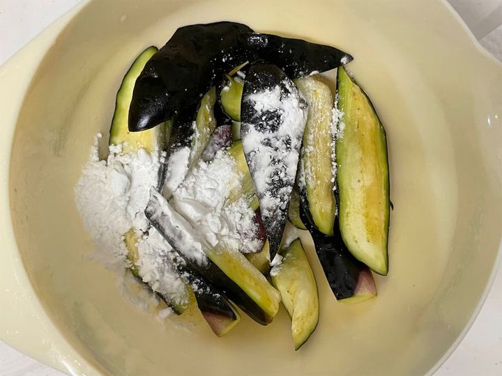 1. ボウルになすを入れたら塩を入れ全体にまぶします。