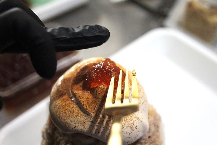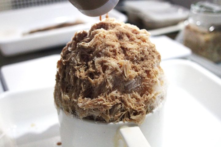 氷で紅茶クリームやクルミをすっぽりと覆い形を整えたら、紅茶ミルクシロップをオン!中のシロップと、外側のシロップとで異なるシロップを使用し、味の変化が楽しめるようになっています。