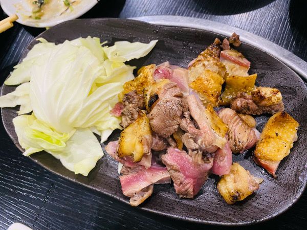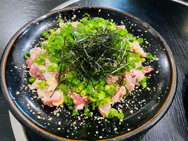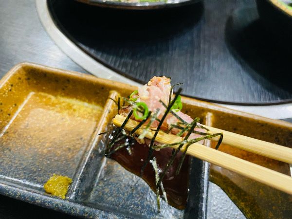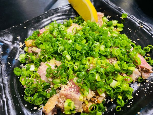 そして極め付けは「炭火たたき」 湯引きより脂が乗っているので、レモンをさっとかけてポン酢でいただきました。 何度も言いますが、ハーフサイズでもしっかりと量があるのでこの4品でかなりお腹いっぱいに。 他にも唐揚げや地鶏のすき焼き風など、食べてみたいメニューがたくさんあったのに残念〜。