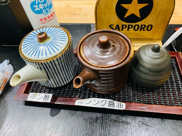 ポン酢もしくはニンニク醤油でお召し上がりください、と説明あり。 卓上には塩や柚子こしょう、一味などもありました。