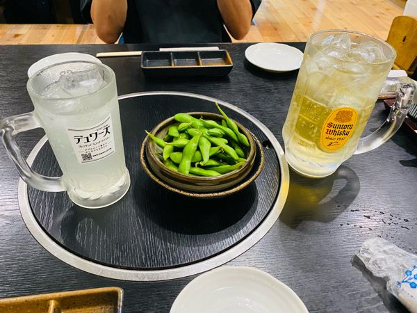 お通しで枝豆とドリンクが運ばれてきました。メニュー表にはなかったですが、メガ角ハイボールも注文OKでした。