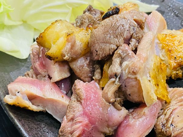 続いては「炭火もも焼き」一番楽しみにしていました。 皮の焼き具合が最高でパリッパリなんです。お肉はミディアムレアで、噛めば噛むほどジューシーな旨味が溢れ出る! 備長炭で豪快に炙っているから香りも最高なんです。もも焼きは柚子こしょうとの相性抜群ですね。