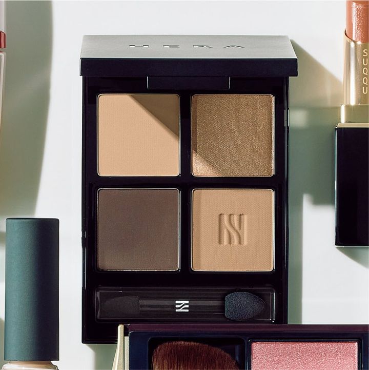 目元には低温のヌードカラーを。ナチュラルな彫深アイをかなえるブラウンシャドウは、HERAのパレットを指名。マットやラメなど、質感が異なる4色がイン。それぞれ冷めた色彩で、さっと塗り重ねるだけで表情にハンサムなニュアンスが添えられます。