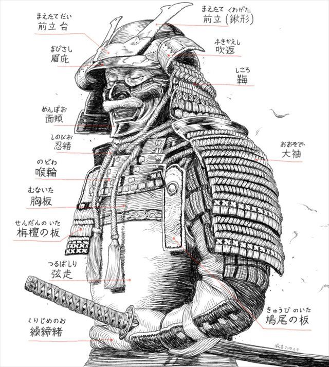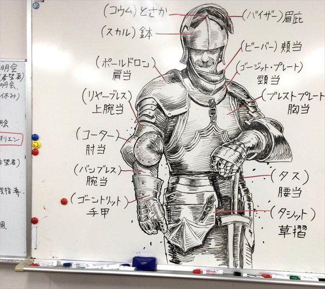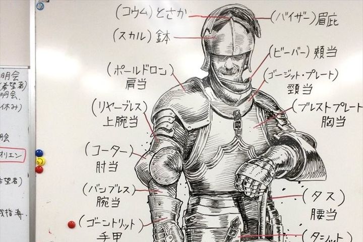 生徒に向け、ホワイトボードに描いたという甲冑と武者鎧の部位名称のまとめがスゴイ!と反響を呼んでいるのでご紹介します。