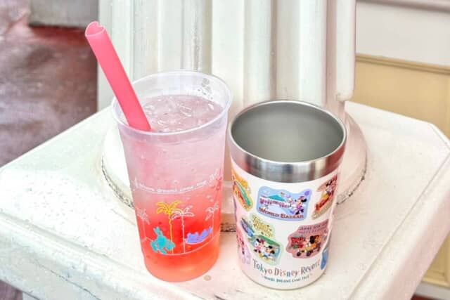▲東京ディズニーランド「リフレッシュメントコーナー」で販売されている「スパークリングドリンク(ホワイトピーチ)」(1杯¥600)は、店内のピンクの色合いをイメージしたドリンクで、かわいらしいピンクのハート型のストローがキュート。炭酸とピーチの甘みがマッチしたさわやかな味わいです。また、プラス¥1,700でスーベニアタンブラーを付けることも可能です
