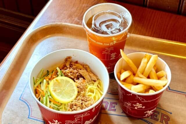 ▲東京ディズニーシー「ドックサイドダイナー」の「チキン&ベジタブルの冷やし麺(塩レモン)」(セット¥1,500)は、鶏そぼろに、鶏むね肉、野菜、輪切りのレモンがトッピングされた冷たい麺に、さっぱりとしたスープをからめて食べれば、のどごし良く食べられます ※セットには、フレンチフライポテトとソフトドリンクが付きます