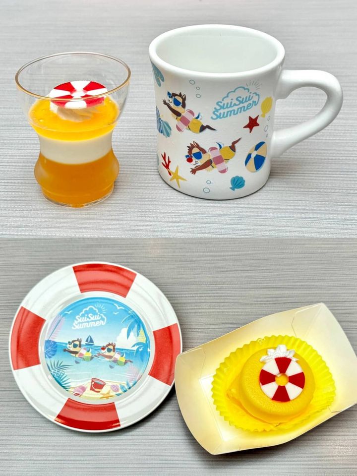 ▲酸味と甘みのバランスがいい「パッションフルーツ・パイナップルゼリー&バニラムース」(1個¥550)にはプラス¥550でスーベニアカップを、そしてレモンソースが入ったチーズケーキに、レモン風味のチョコソースがかかった「チーズケーキ」(1個¥550)には、浮き輪のデザインで縁取られたスーベニアプレートが¥550で付けることができます ※どちらも2024年8月31日までの販売
