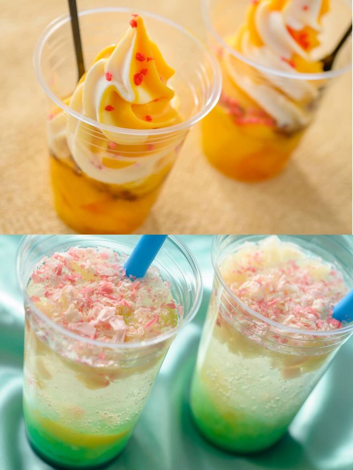 ▲東京ディズニーランド「スクウィーザーズ・トロピカル・ジュースバー」では、マンゴーとミルクのミックスソフトクリームにマンゴーゼリーや果肉を加えたマンゴーづくしのみずみずしい「マンゴーサンデー」(1個¥680)が登場。ジェラトーニをイメージしたドリンクがリニューアルして登場する東京ディズニーシー「ケープコッド・クックオフ」の「ジェラトーニのリモナータ(ピーチ&乳酸菌飲料)」(1杯¥700)は、ピーチの果肉とレモンゼリーが入った、炭酸の効いた乳酸菌飲料で、暑い季節にぴったりなさっぱりとした味わいです ©Disney