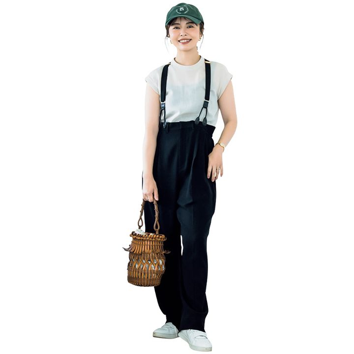 そろそろヘアカラーしなきゃ、というタイミングで活躍するのがキャップ。ざっくり下にポニーテールを作ってから帽子をかぶり、顔まわりのニュアンスを引き出していくのがカギ。特にこめかみの毛を出すと小顔効果も!