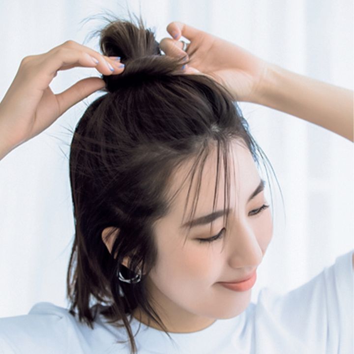 前髪とこめかみの毛を残して、高い位置にゴムでお団子を作ります。毛先はねじりながらゴムに巻き付けるようにしてピンで留めて。ラフさが大事なので、束感を出すのは前髪のみ。