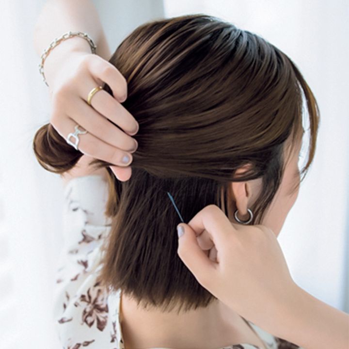 サイドの毛を少し残してハーフアップにしながらゴムでお団子を作ります。耳を隠すようにサイドの毛をピンで留めると古臭さのない仕上がりに。前髪もこめかみに流すことを意識します。