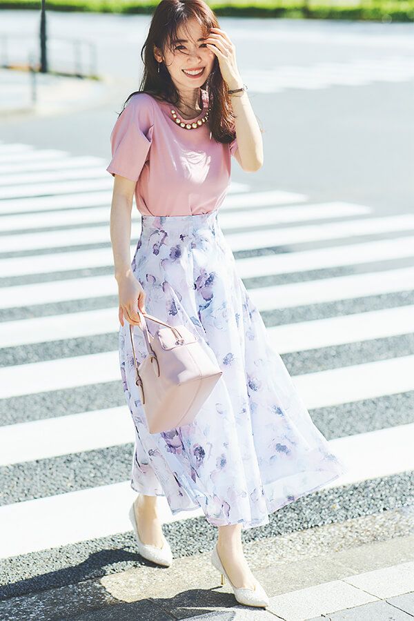 Tシャツなのにきちんと見えるから通勤にも!×花柄スカートでドラマチックに