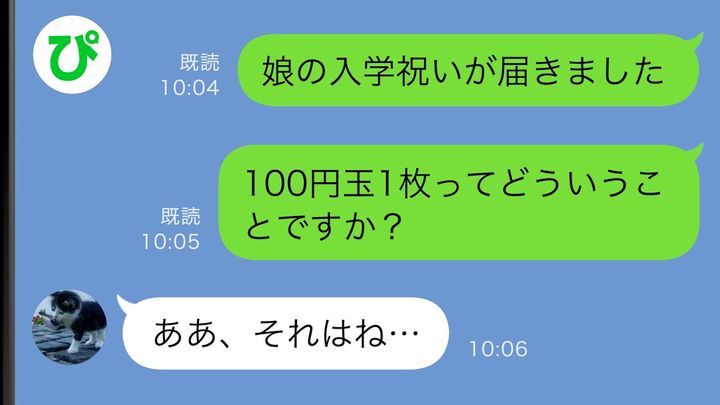 そして、娘が高校に入学。制服姿を写真に撮って義母に送ったところ、お祝いが届きました。封筒の中にはなんと100円玉が1枚!
