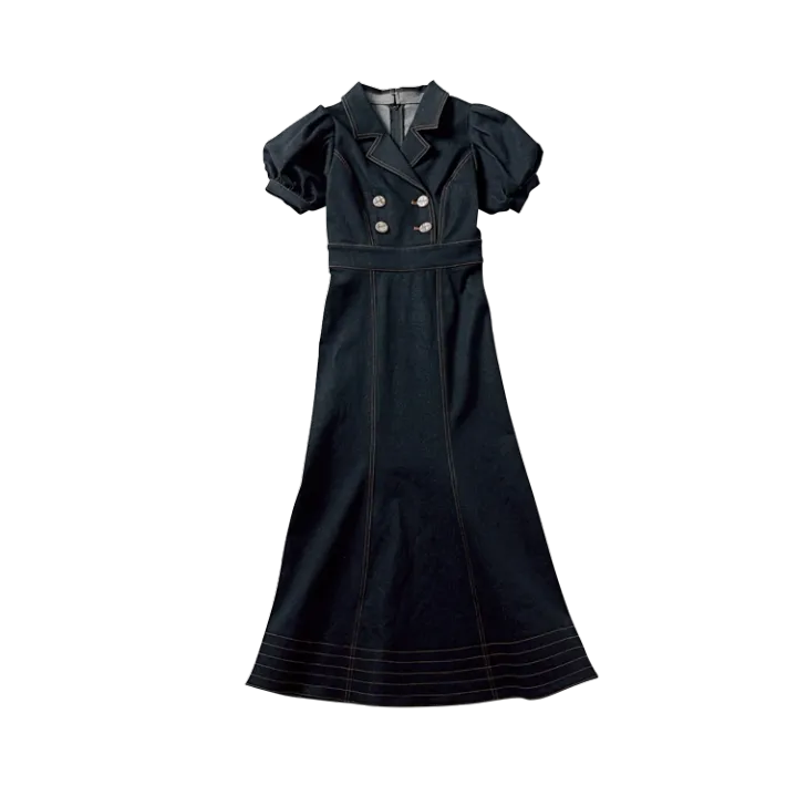 胸元のダブルボタン、ボリュームそでなどクラシカルな要素でまわりと差がつくデニムワンピ。