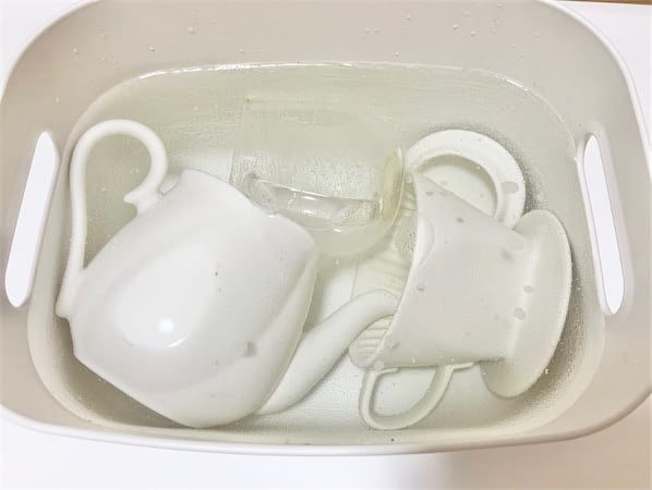 ガラスのマグカップとティーポット、コーヒードリッパーの3点をオキシ漬けしていきます。今回は4Lのオキシ溶液を用意しました。それでは30分漬けてみましょう!
