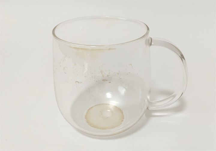 こちらは、2年ほど毎日使っている耐熱ガラスのカップです。きれいに洗っているつもりでしたが、よく見ると食器用洗剤で落とし切れなかった茶渋が目立っていますね〜。口のまわりや底はもちろん、全体的にくすんでしまっています。