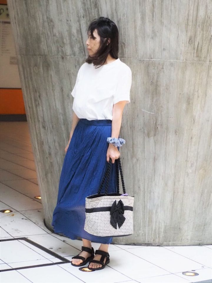 シンプルな白Tシャツに映えるブルーのスカートは、なおこさんのベストバイアイテム。「実はこれ、赤、黄色、緑など10色くらいカラーバリエーションがあって。どれも可愛かったのですが、私は涼しげなブルーを選びました」。サラッとした質感のインド綿を使用していて、夏のおしゃれの必需品なのだとか。