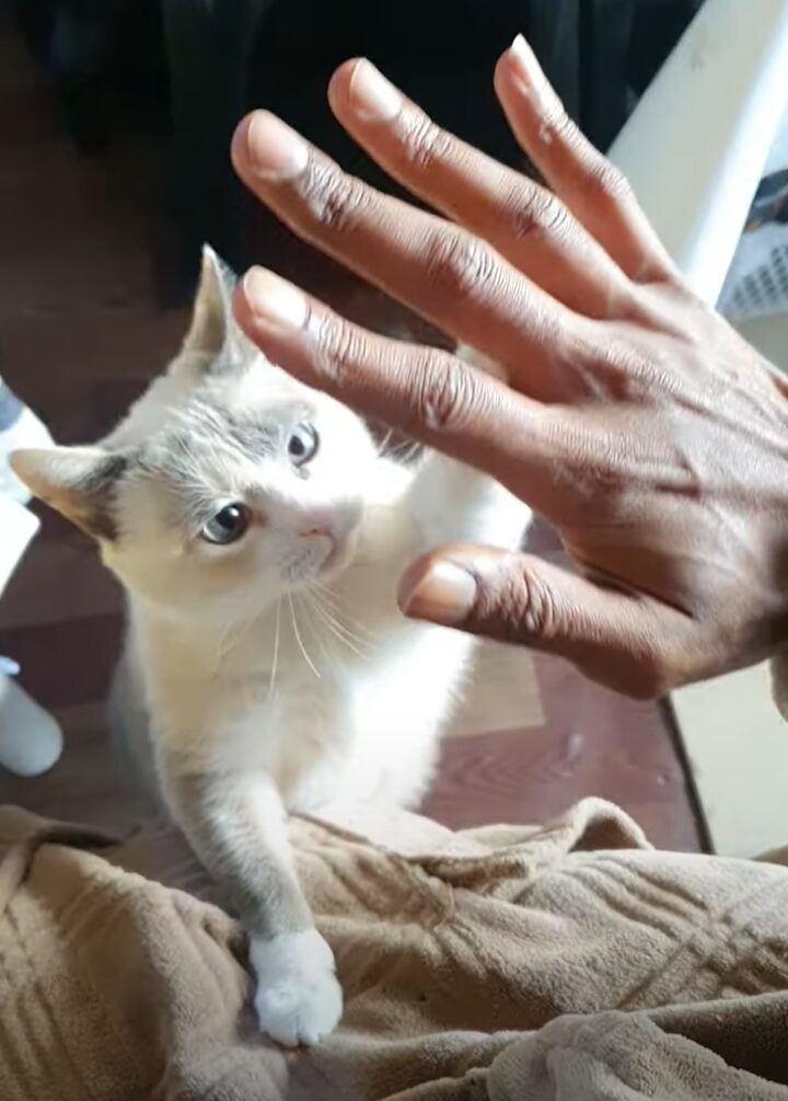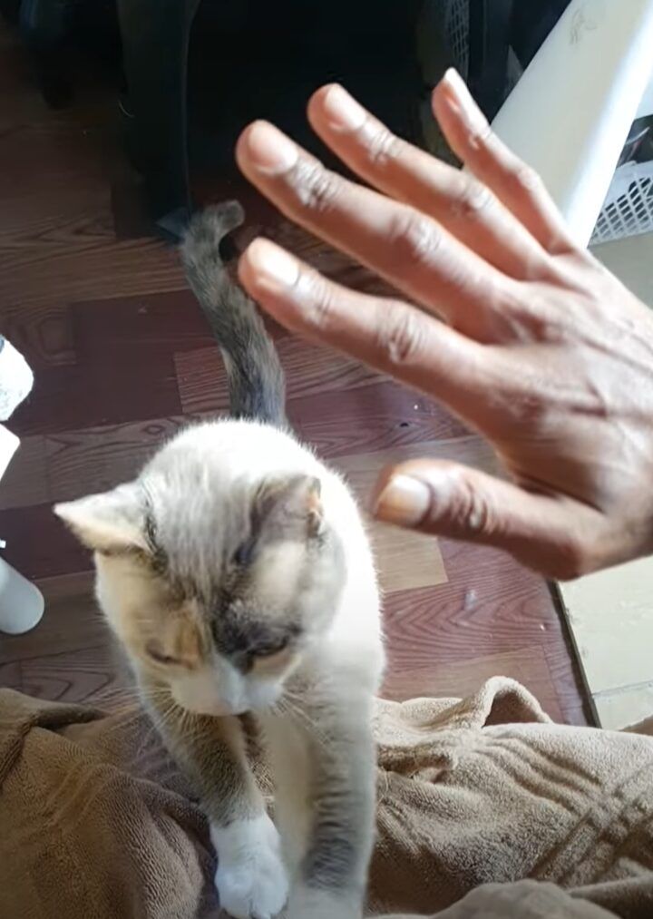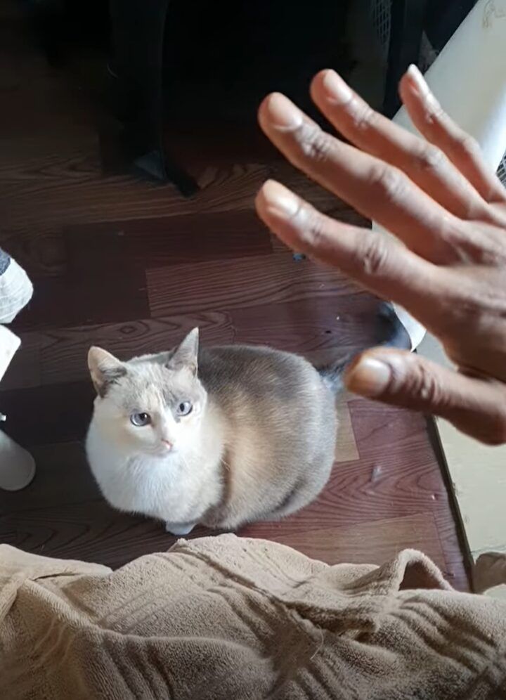 愛猫のサトリちゃんに向かって手を差し出した飼い主さん。 いったい何をしようとしているのかと思えば・・・