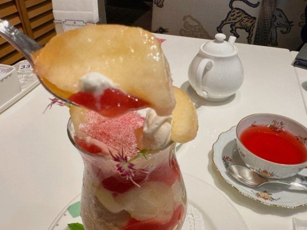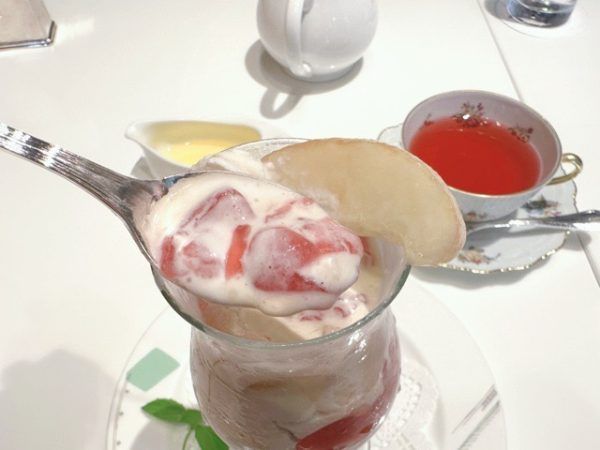 そして、どこを食べても新鮮な桃が一緒に口に入るのが嬉しい♡パフェを食べていてたまに気になるのですが、上の方にはのフルーツがあるのに、下に行くと主役はいなくて食べ終わる頃には「なんのパフェを食べたっけ?」と思う時、ありませんか? このパフェは違います。どの層を食べても一緒に桃がいて、桃と紅茶アイス、桃とメレンゲ、桃と木苺ゼリーなど常に桃を食べている実感があるのです。先ほどのインタビューで日髙シェフが「あくまで桃が主役のパフェ」とおっしゃってたことの伏線回収ができたような気がしました。