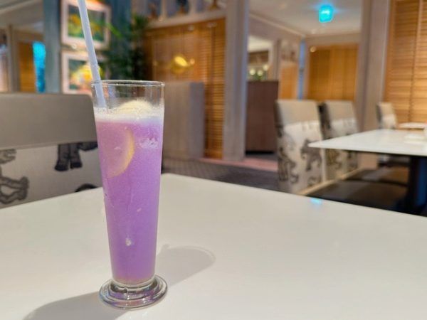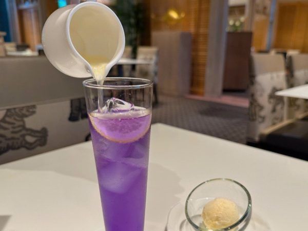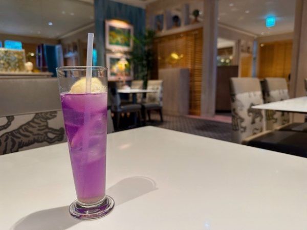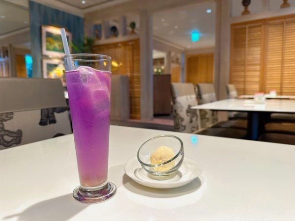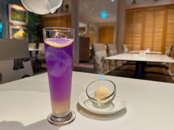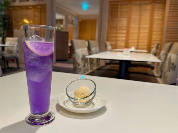 明るい紫色へと変化しました!!紫陽花を思い浮かべるような美しい紫色はこの時期のドリンクとしてもぴったりですね。さすが「季節をお知らせする場所」ですね!ここでちょっとだけドリンクを飲んでみました。 自家製のレモンシロップは濃厚でしっかりとした甘みがありながらも、レモンの酸味や苦みも感じる奥深い味わいが特徴です。レモンの粒感も感じられ、手間暇を惜しまないホテル自家製のシロップだからこそ味わえる高級感のあるドリンクです。 夏の暑さで疲れた身体に染み渡るような、目にも喉にも爽やかなバタフライエイド!!甘いだけの飲み物が苦手な大人のみなさんにおすすめです。