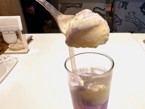 さて、ここからさらに「ホテル日航福岡らしさ」を感じる魔法を栗林さんに代わってわたしがお見せしましょう。 先ほど隣にあった別添えのアイスクリームをドリンクにプラスします。わお!!贅沢なフロートに変身です♡大人の飲み物も魅力的ですが、甘いの大好きなわたしにはこちらがなお嬉しい(笑)このアイスクリームにも秘密が隠されているんです。