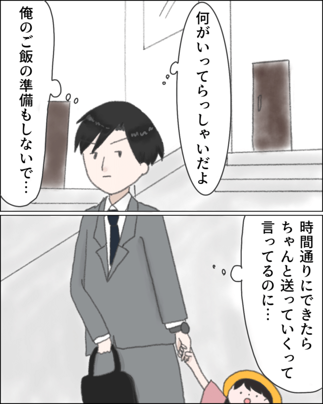 そして次の日の朝、「あれ?俺のご飯は?」というカズヒデさんに「自分で準備して」と言うアズサさん、バタバタとリコちゃんの登園準備をしてなんとか出発時間に間に合い、カズヒデさんがリコちゃんを送って行くことになったものの、「本当に準備してないとか・・おかしくない?」と不満たらたらで・・
