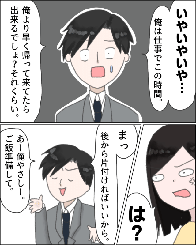 「いやいやいや・・俺は仕事でこの時間。俺より早く帰って来てたらできるでしょ?それくらい」