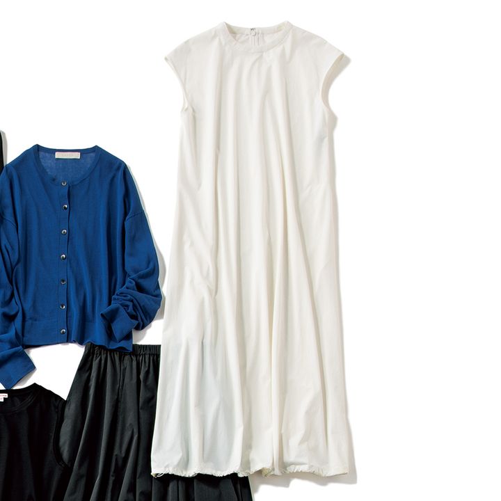 雨の日も飲食のシミにも強気でいられる!裾のドロストを絞るとバルーンシルエットに変形します。ワンピース¥21,890(アンクレイヴ スタンダード/オンワード樫山)
