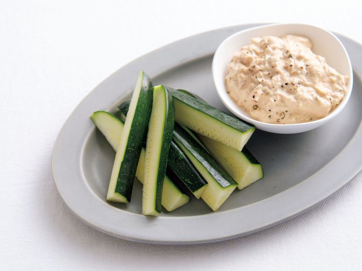(2)ズッキーニはへたを切り、縦8等分に切って器に盛る。(1)を添え、ズッキーニにつけていただく。