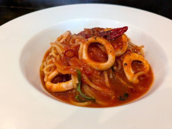 お店のパスタは生麺を使用とのことで、家ではなかなか味わえない食感。もちもち好きにはたまりません。もちっとしたパスタがソースとよく絡み、イカは柔らかくトマトの旨味にピリッと唐辛子とバジルの香りが食欲をかき立てます。