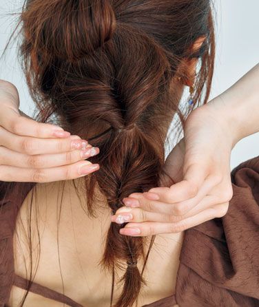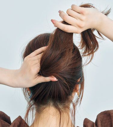 襟足に多めに後れ毛を残しながら、耳の高さでループおだんごをつくる。後れ毛は細くランダムに出すのがコツ。