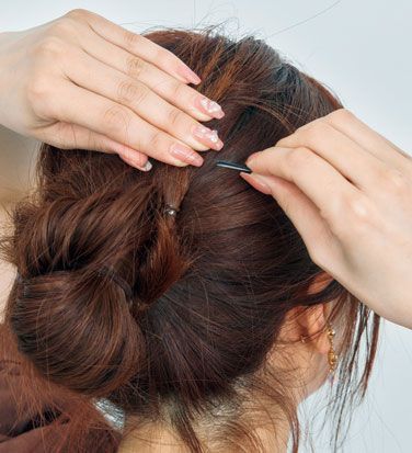 2の毛束をぐるっと巻きつけてピンで固定。ほどよいゆるさがありつつ、くるりんぱをしているので崩れ知らず。