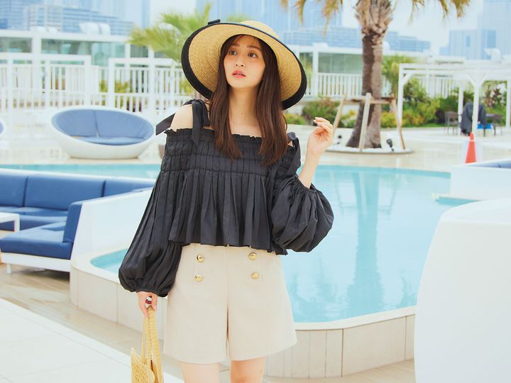 オフショルトップスの肌見せで軽さを出しつつ、ブラックカラーできりっと引き締めて。ブラックのトリミングがフレンチムードなハットでパリっぽく♡