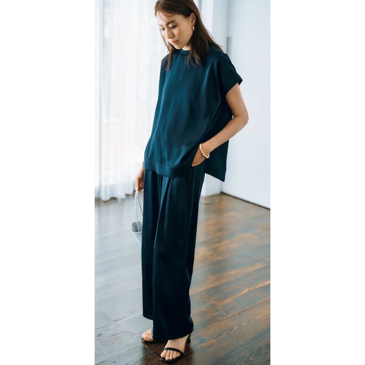 INせずサマ見えするトップスは 上下セットでも単品でも使える。 微光沢サテンできちんと感UP