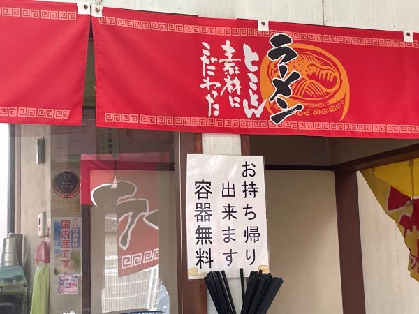 カウンター上の暖簾。 ”とことん素材にこだわったラーメン” にお店の主張を感じます。 それ以上に驚くのは、「お持ち帰り出来ます 容器無料」の張り紙。 コンビニ袋、持ち帰り容器など有料が当たり前のなか、「容器無料」は久しぶりに見ました。