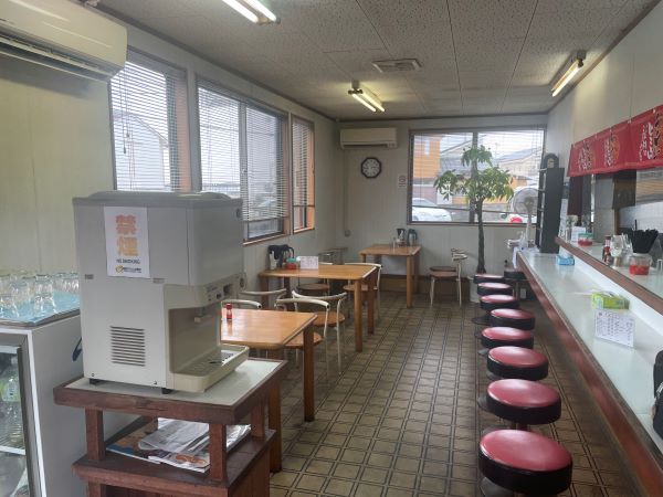 店内は、セルフサービスの冷水器が置かれ、座席は4人掛けのテーブル席、カウンター8席です。 まさに、町中華の標準仕様という感じの店内風景です。