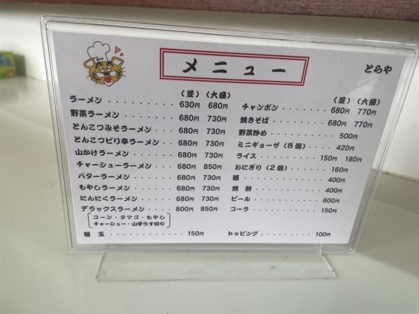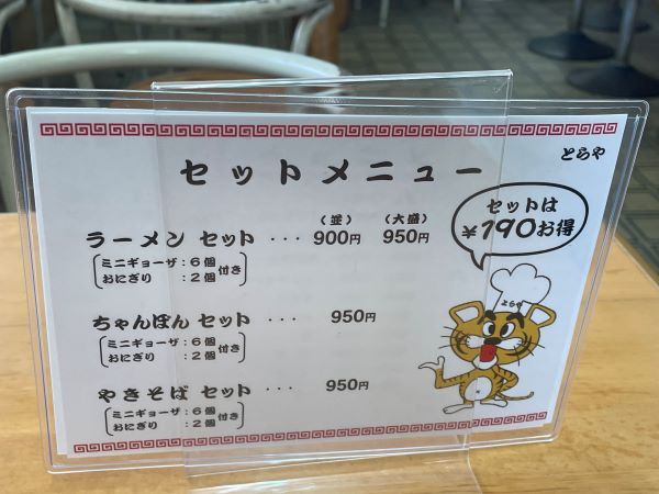 ここ、「とらやらーめん」の魅力が ”セットメニュー” です。 ラーメン、ちゃんぽん、やきそばの何れかに、ミニギョーザ6個、おにぎり2個がついた定食メニュー。 普通、ランチタイム限定のサービス定食の位置付けですが、営業時間中いつでも注文可能なのは粋な設定です。