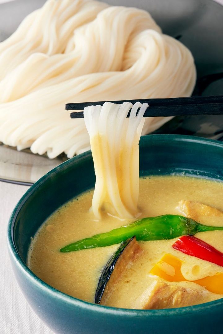 「佐藤養助商店」の稲庭うどんは一本一本が手作りの芸術品と称される老舗の味。まろやかで濃厚なグリーンカレーにつける、新しい楽しみ方も絶品。ぜひ試してみて!