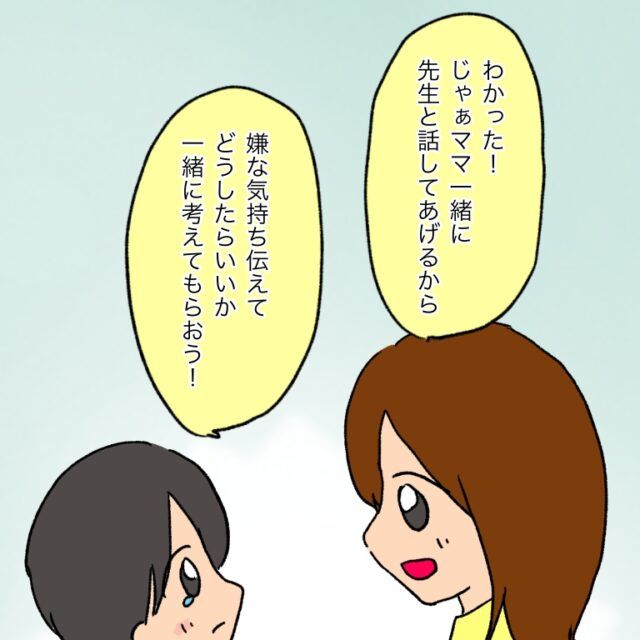 「わかった!じゃあママ一緒に先生と話してあげるから、嫌な気持ち伝えてどうしたらいいか一緒に考えてもらおう!」