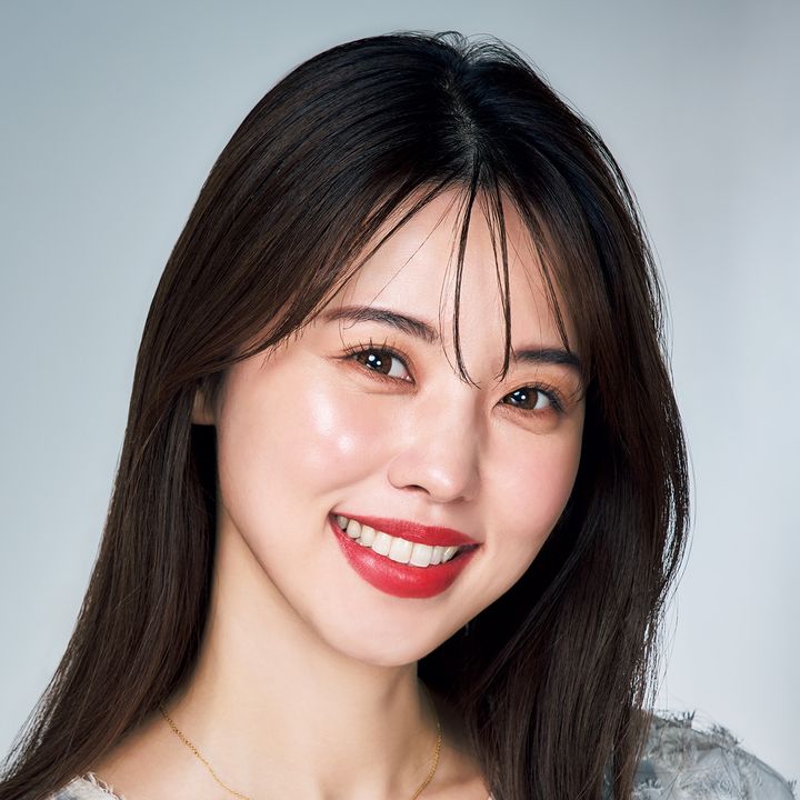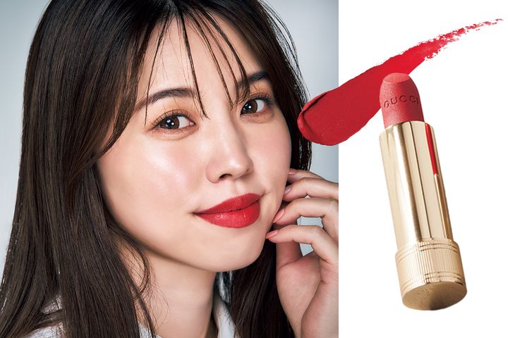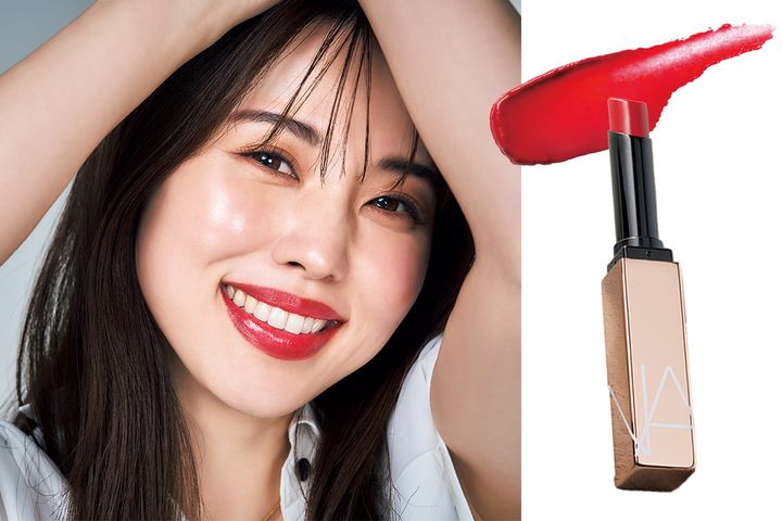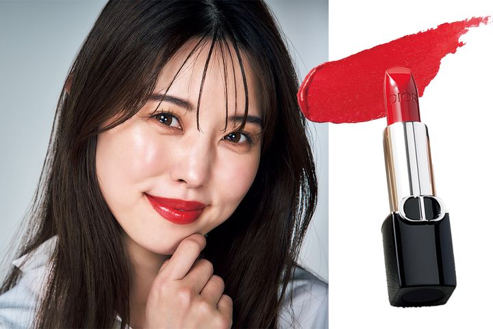 印象的な濃いレッドは大人のくすみ肌も吹き飛ばす。「ハッとする真っ赤はひと塗りで元気で華やかな顔に」。(神戸さん)