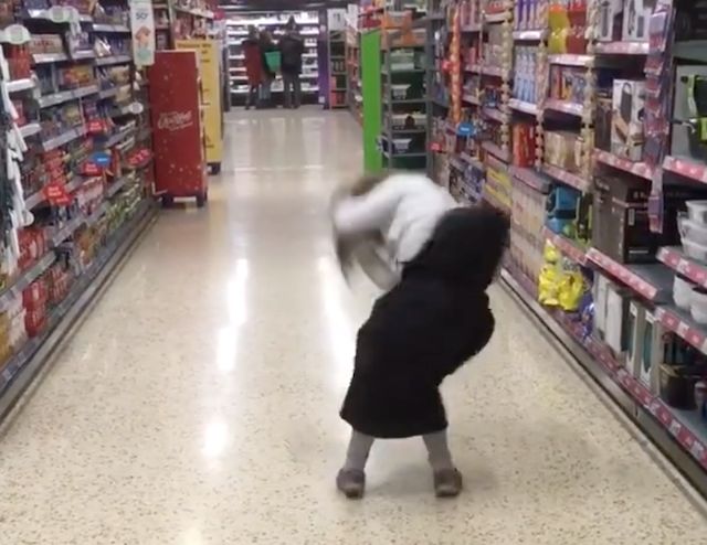 スーパーの店内をよちよち歩いている黒いジャケットにフードをかぶった小さな子ども。 1歳くらいの女の子が歩いているのかなぁ~?と思いきや・・・この後の展開に思わずビックリすると共に笑えて来てしまいます。
