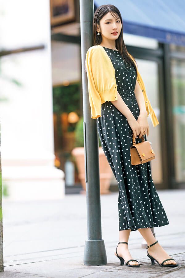 甘いドット柄もいいけれど、ときには黒ベースで大人っぽさを狙うのも彼の目に新鮮に映るはず。短丈カーデで色を差し、華感も盛り上げて。