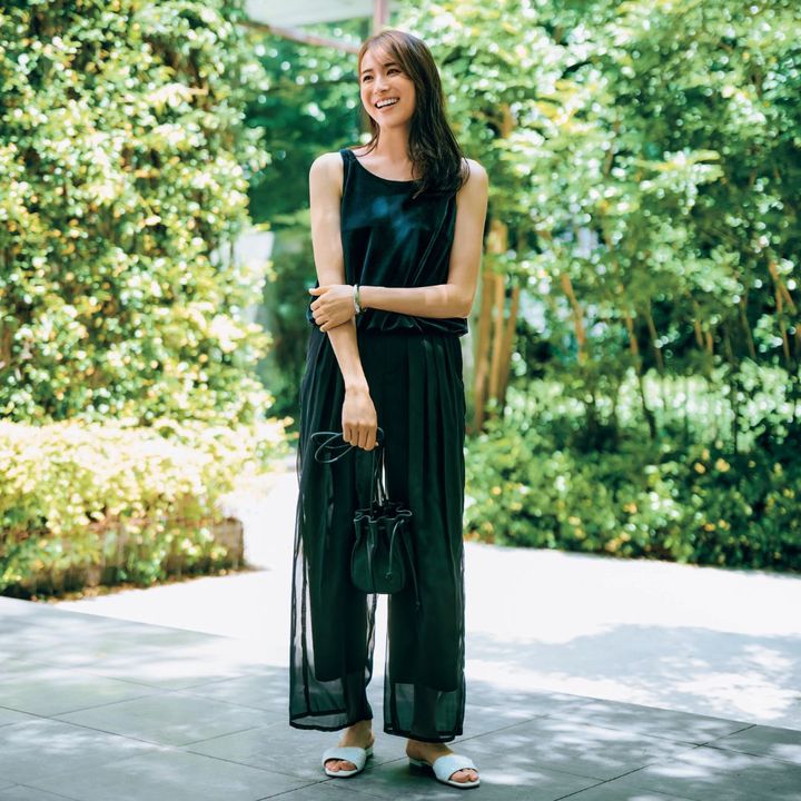 涼やかなシアーパンツに 夏に着るベロアが新鮮。 ミニマルな旬スタイルに