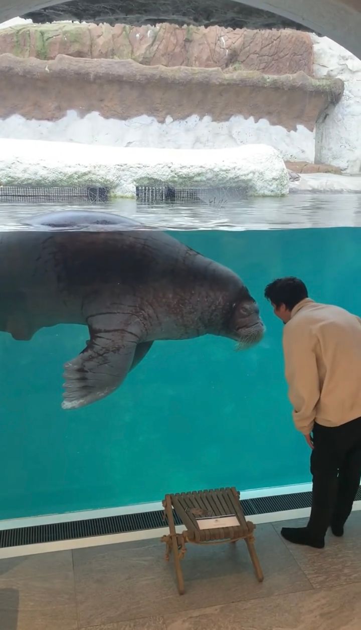 セイウチも男性に興味を示していますよ。 それにしても巨大な水槽ですね~。