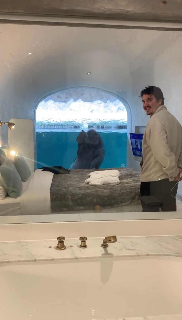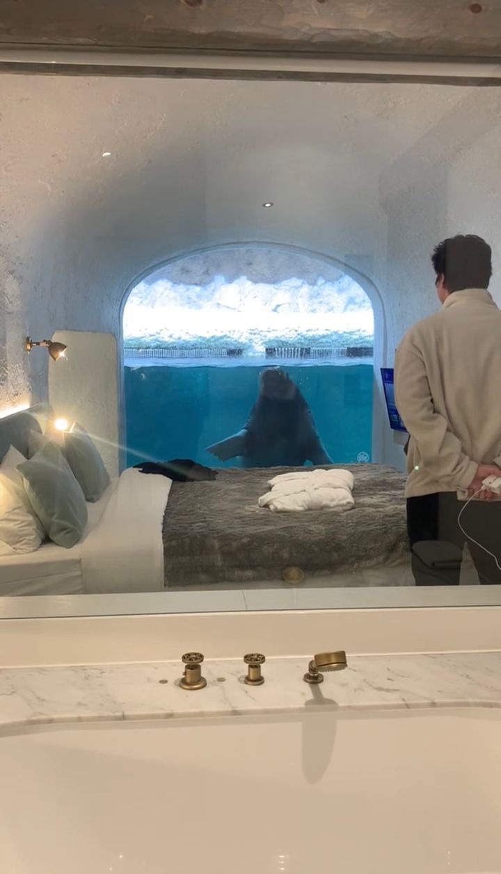 ガラス越しに顔を寄せて見つめ合うふたり。 一見すると水族館での一コマのようですが、まさかのホテルの客室だというのですから驚きです。