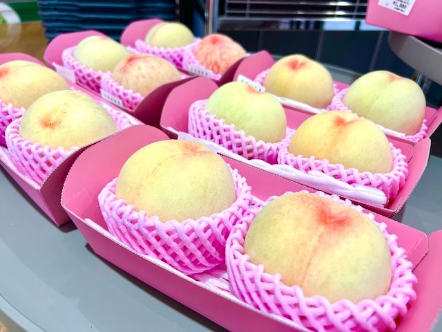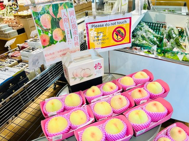 今回話題となった岡山県産の白桃の旬は7月〜8月いっぱいくらい。新橋にあるアンテナショップ「とっとり・おかやま新橋館」にも今が食べ頃の桃が並んでいました。岡山の白桃は柔らかくて甘いのが魅力です。