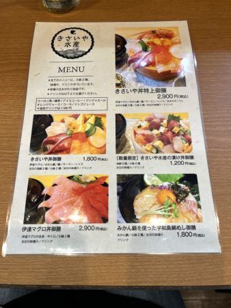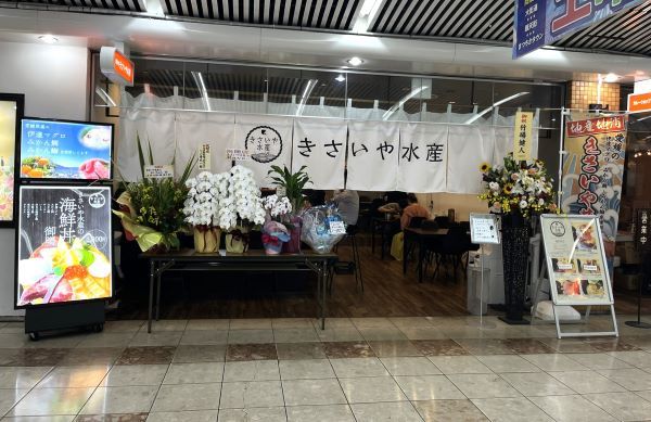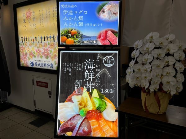 今年6月22日、まつちかタウン内にオープンした「きさいや水産」さん。「愛媛県産の伊達マグロ・みかん鯛・みかん鰤」が食べられるお店です。伺ったのは、オープンから5日後。お昼時には、サラリーマンや地元の方が次々に訪れていました。