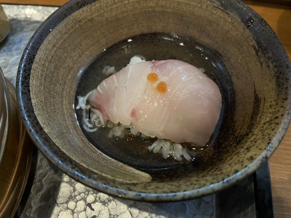お好みで「出汁茶漬け用」も楽しめます!この日の出汁は、「カツオと昆布」。 私は海鮮丼を堪能しすぎて出汁茶漬け用にはこの一口分しか残せませんでしたが、優しい味わいでまた違った美味しさでした。お皿にご飯を取り分ける前に、出汁だけを味わうことができるのもよかったです。