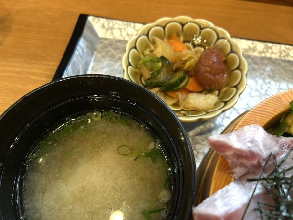 「本日のお味噌汁」である、南予の麦みそを使った「かんぱちのお味噌汁」。香りから美味しさが伝わってきます。小鉢は、味がしみ込んだ大根とごぼうの煮物。お漬物は、梅干しも入っていたので「珍しいなー」と思い伺ってみると、なんと店主のおばあさまのレシピで手作りされたものでした。
