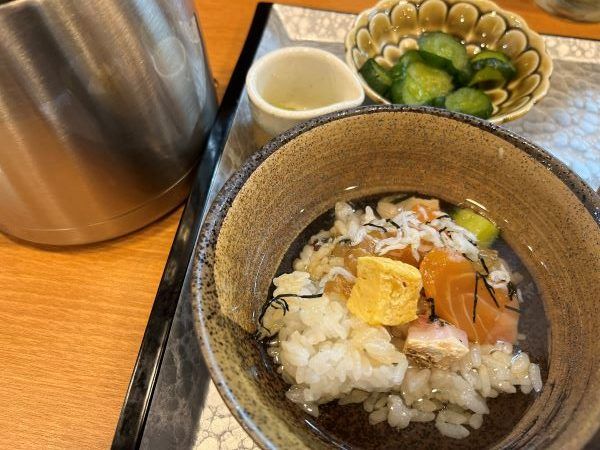 この日の出汁は「昆布といりこ」。角切りにされた具材と共に、サラサラとお腹の中に入っていくため、食欲落ちる夏にもよさそうです。この日のお漬物は、店主のご出身である西予市で作られる「からし漬け」だと教えていただきました。各家庭で味が少しづつ違うそうで、店主が食べてきた味で作ったんだそう。「地元の味」を味わうことができた嬉しいお昼になりました。